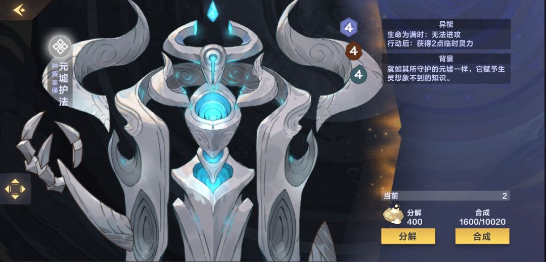 【元墟护法】行动后获得2点临时灵力,不要小看临时灵力,4费下了之后下回合有7费可以下【梦境大军】了,4/4的身材前期可以阻挡大多数小随从(你4费下,对手可能只有3费),要注意即使生命不满用【梦境大军】变成7/7生命就满了,还是不能进攻,但是万一对面前排的随从撞上了后排的【元墟护法】呢?这不就巧了么