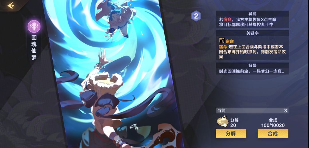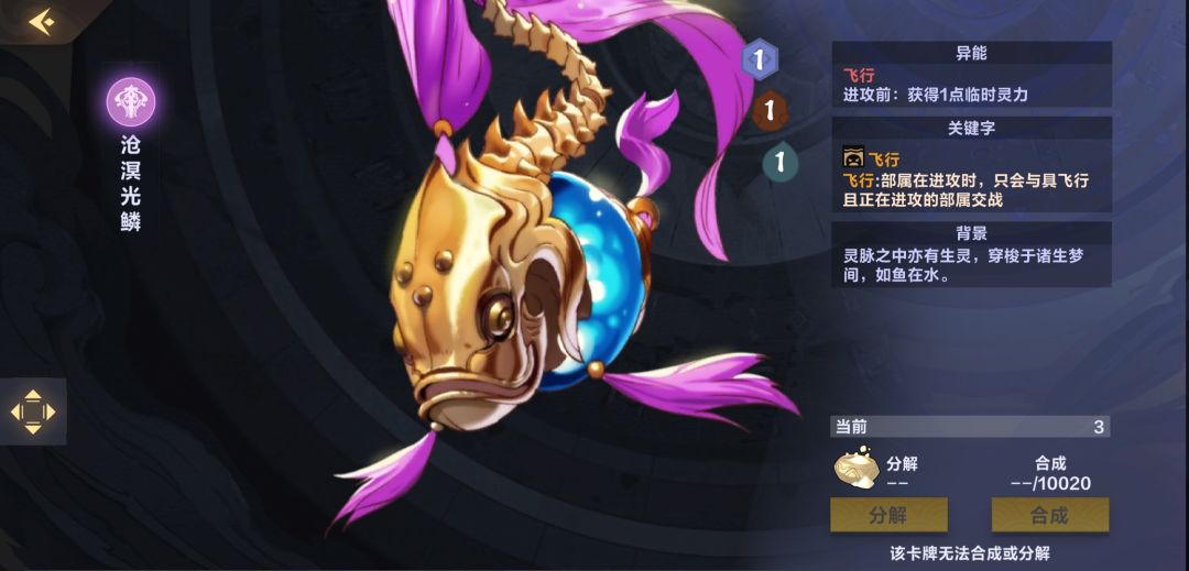 【沧溟光鳞】这张卡的作用是可以进攻时获得临时灵力,并且是飞行单位被buff后不容易被阻挡可以打出高伤害,但是这张卡本身身材很差1/1前期很可能被【铁拳斗士】单杀,所以不建议1费单下,除非实在没有跳费的手段只能赌对面看不上你这只小鱼,打这张卡比较好的时机是在打【梦境大军】前的一回合在末位拍一张,下回合直接buff走脸就很舒服,或者在场上有其他比较嘲讽的随从时偷偷下一张,蹭一点临时灵力,后期可以贴【灵海共鸣】进行最后的斩杀