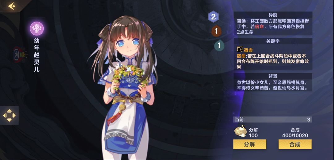 【幼年赵灵儿】这张卡用法比较多,主要是当成法术来用,给buff过的随从开路,回手正面阻挡的敌方部署保证能把伤害打到脸上,也可以用来回手对面大哥解场,由于是部署的技能可以无视魔法免疫,可以处理有魔免的敌方部署,用完之后可以贴【灵海共鸣】或者【梦境大军】继续发光发热,此外这张卡宿命有全体回2血的效果,主将回血的优先级非常高,即使被封印也是先回血再被封印。