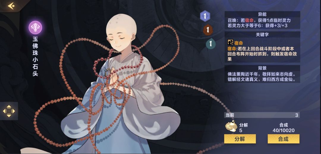 【玉佛珠小石头】1费打出下回合接【灵祖遗孤】是常见组合,另外6费时会+3/+3有时有出其不意的效果,比如4费的时候对面想用杂鱼阻挡你,但是你甲位下了【元墟护法】获得2点临时灵力,这回合小石头会变成4/4吃掉对面的杂鱼,下回合灵力用了又变回1/1替其他部署挡个【狩猎献礼】
