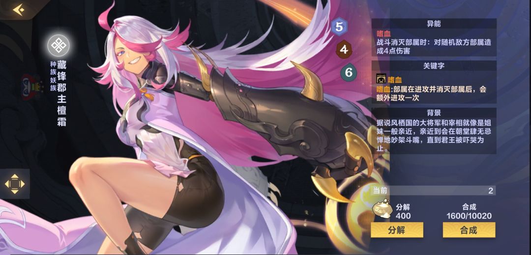 【藏锋郡主檀霜】4/6的身材保证了她的生存能力,也让她能更好的去碰瓷对面的部署,尤其是去阻挡卡在角落里无法移动的低攻部署,还能再打另一个部署4血,自己残血了不要紧,一个【梦境大军】又能打了,还带嗜血,死了还能被【希望根源】拉回手牌,有什么理由不带她?