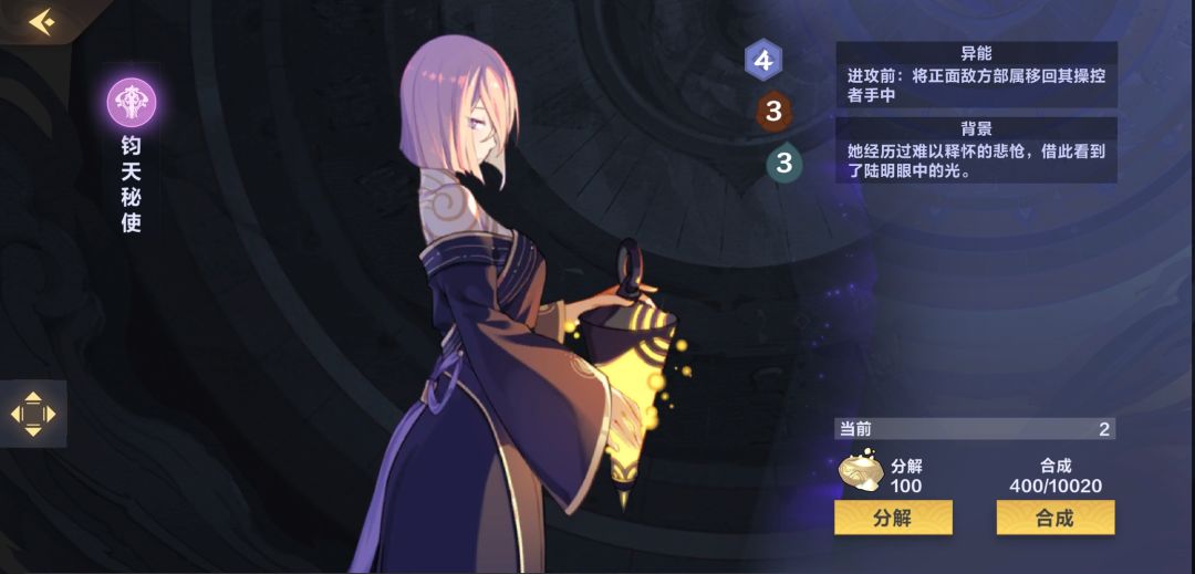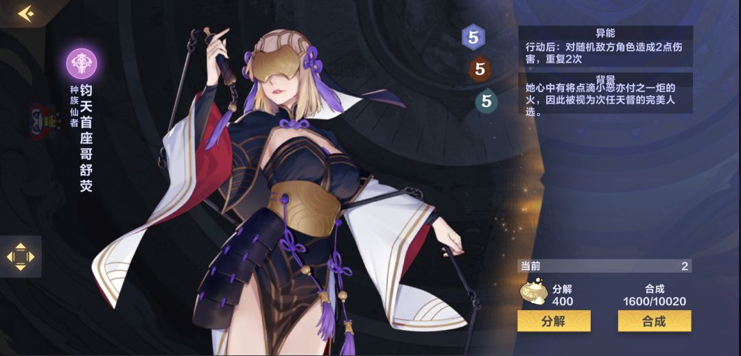 【钧天首座哥舒荧】行动后随机打2打2,用来清理杂鱼和伤兵,对面没有部署还能打脸,能更好的让其他部署把伤害打到对面主将上,打土的时候可能会是内奸,5费在这套卡组中很容易被【希望根源】从墓地拉回手牌