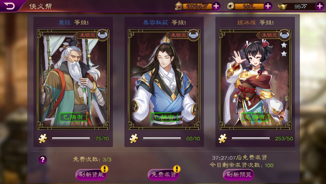 刷新的侠客不会重复,只能刷新出自己已经拥有的侠客。每个活动周期上的时候有3次免费刷新次数。每个周期玩家会有1次免费求贤的机会。