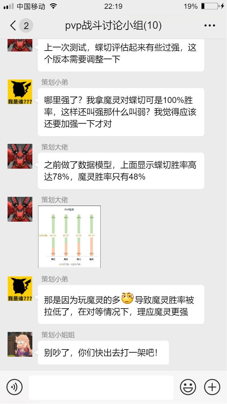 策划们在群里讨论着蝶切。