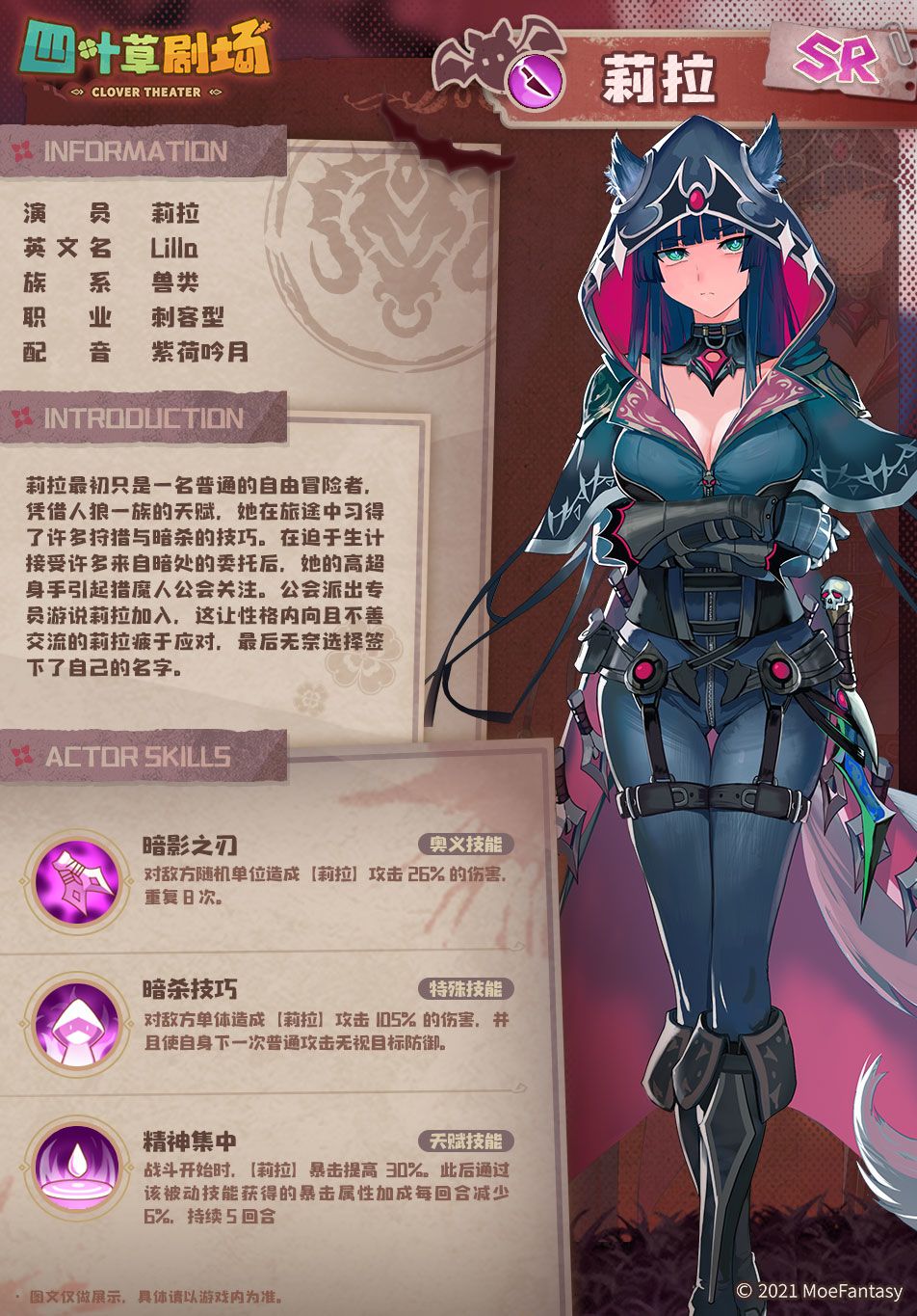 莉拉最初只是一名普通的自由冒险者,凭借人狼一族的天赋,她在旅途中习得了许多狩猎与暗杀的技巧。在迫于生计接受许多来自暗处的委托后,她的高超身手引起猎魔人公会关注。公会派出专员游说莉拉加入,这让性格内向且不善交流的莉拉疲于应对,最后无奈选择签下了自己的名字。
