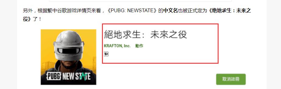 根据繁中谷歌游戏详情页来看,《PUBG: NEWSTATE》的中文名也被正式定为《绝地求生:未来之役》了!