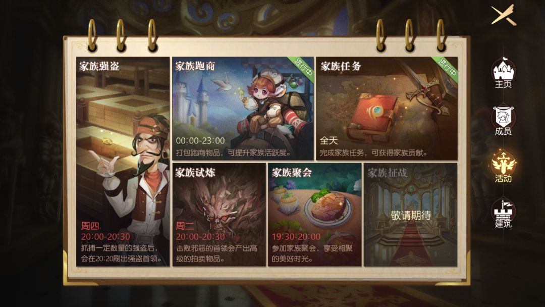 每周二晚、周五晚上 20:00-20:30,全体家族成员可以参加家族试炼