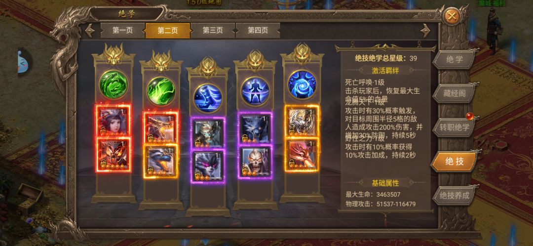 3.绝技等级上限为120级,初始1级,可以在绝技养成-升级中通过消耗其他绝技或专门的经验道具来提升等级。提升等级可以提升绝技的基础属性,不同星级对应不同的等级上限。