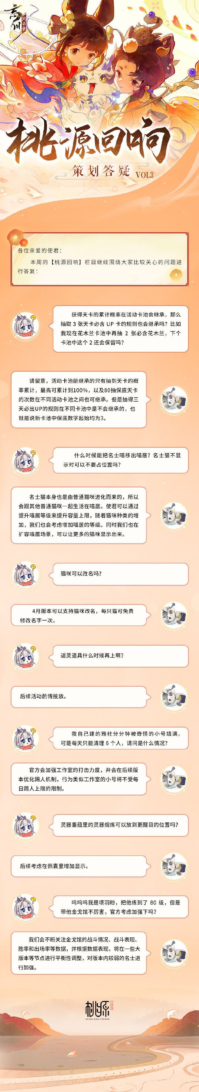 转眼间公测已近一月,对于这段时间使君们关心反馈的活动卡池、猫咪改名问题,这次开发组都有回应啦!使君有其他想问的问题也可以在评论区提问~