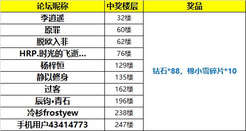 幸运奖(10名):钻石*88,棉小雪碎片*10