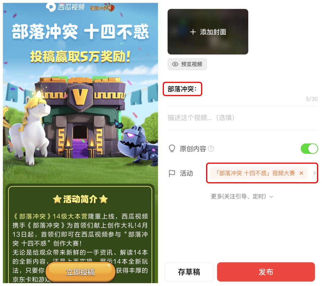 • 视频应围绕《部落冲突》进行创作,内容符合投稿要求,并在标题中添加活动要求的主题关键字、勾选活动标签。