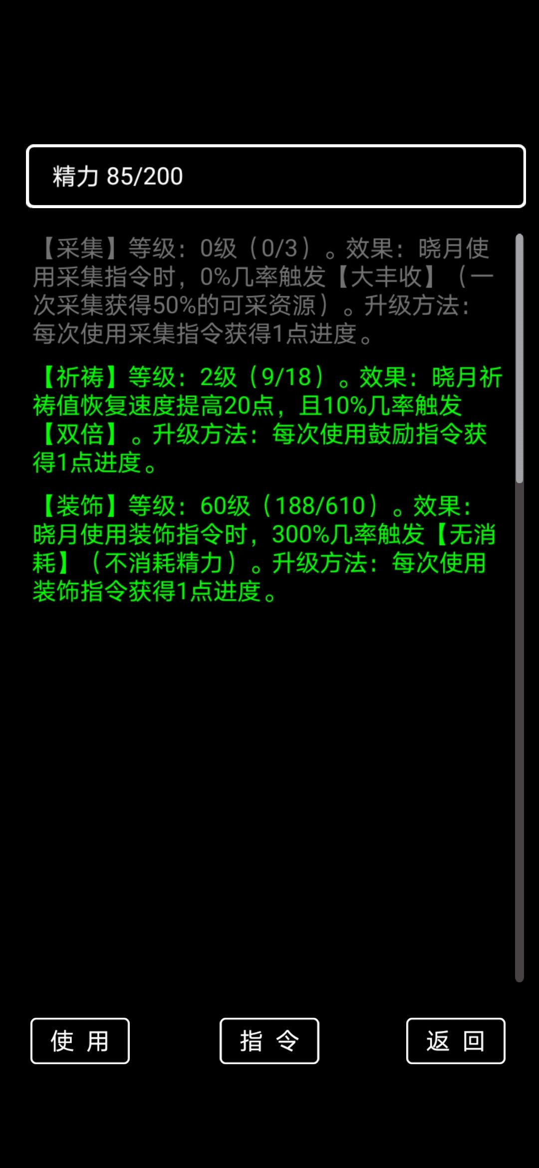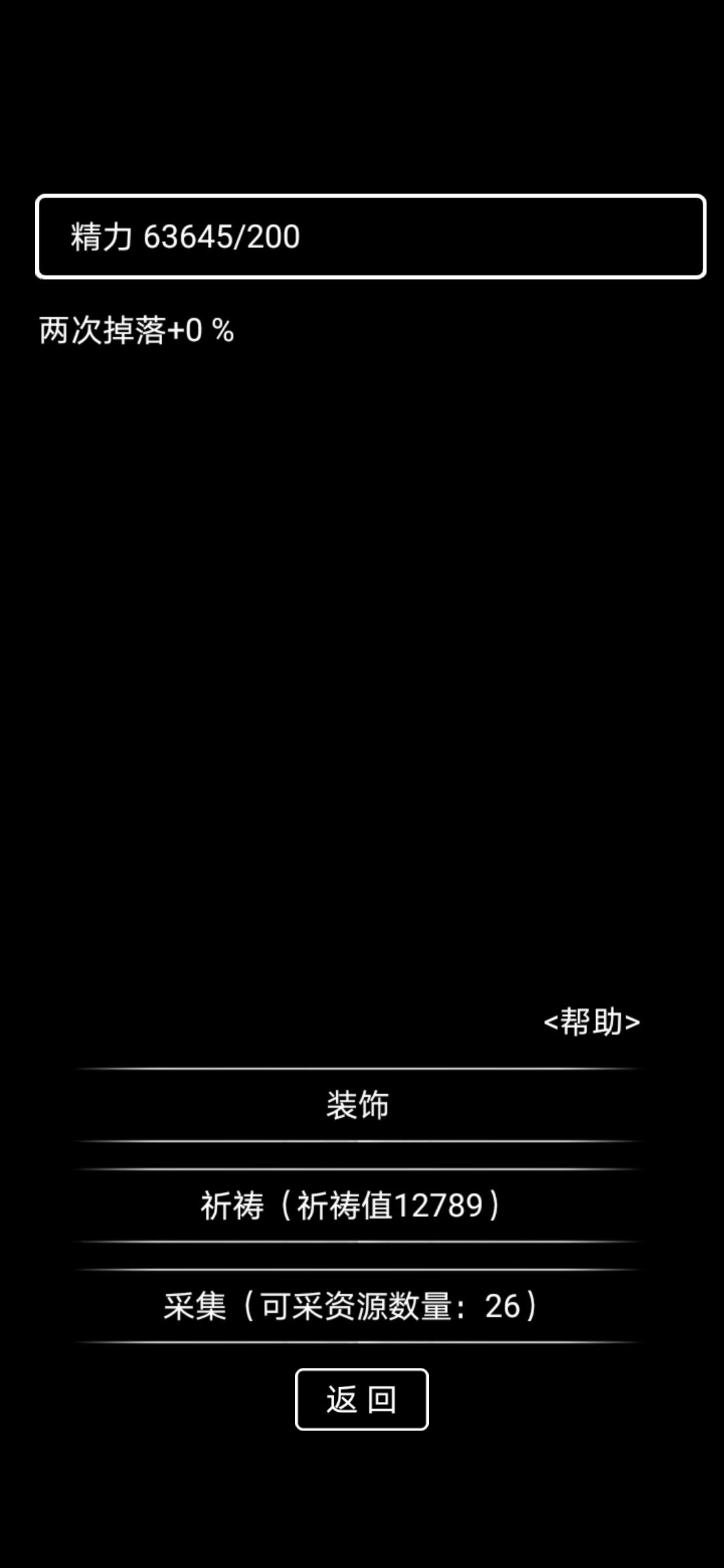 途中犯了不少错,开始不清楚装饰要求精力30+,又想兼顾祈祷(后来发现貌似祈祷不太需要早点),然后探索没留精力,刷装饰时不小心按到休息键只能强退(少了一次去县城的精力)