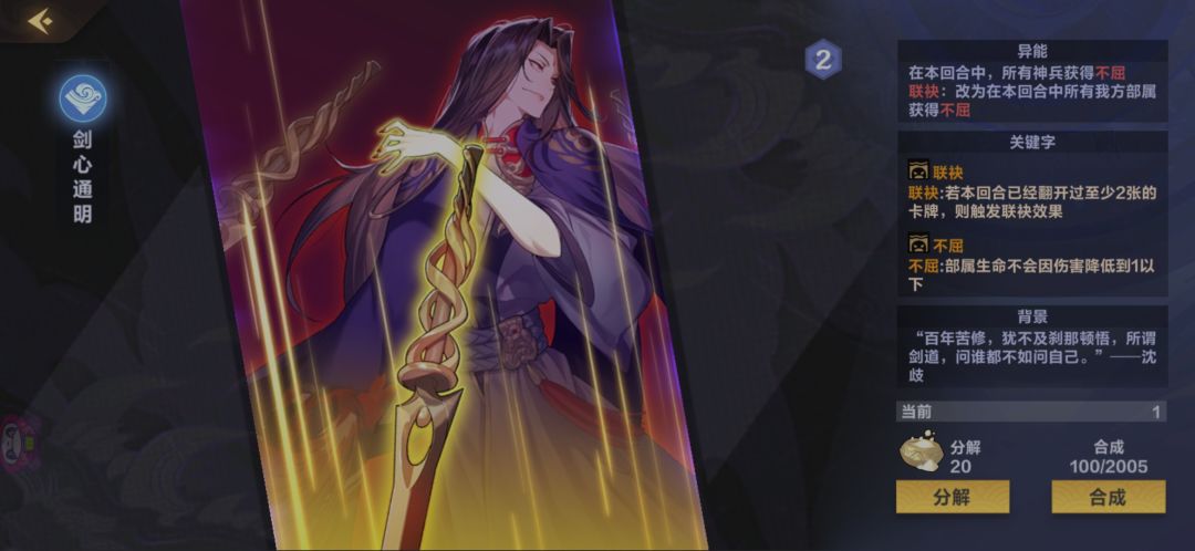 剑心通明,2费给在场神兵挂不屈,联袂所有部属不屈。预判aoe保场面的神卡,一张即可多了卡手。