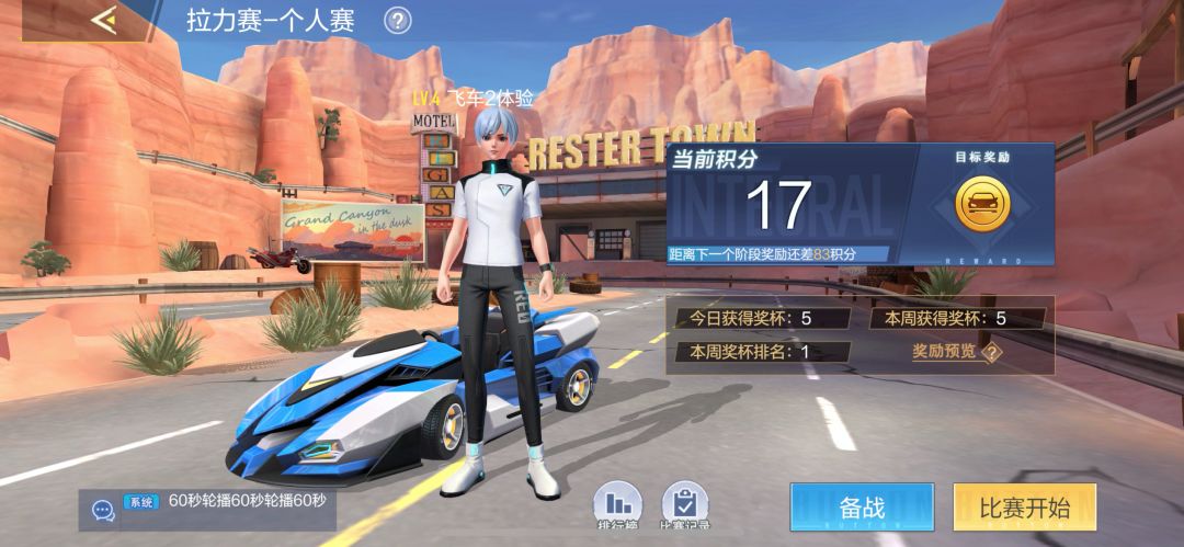 在游戏界面中会出现自己的个人信息,包括积分、奖杯和排名等。点击【比赛开始】就可以进入到激动人心的【拉力赛】中啦~