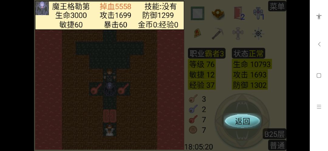 这个职业不会中毒,衰弱,所以红绿瓶子没用,技能是受伤害能反击...好吧,我也不知道这技能魔塔里这到底有多大用...直接上最终数据图,最后走的假结局。