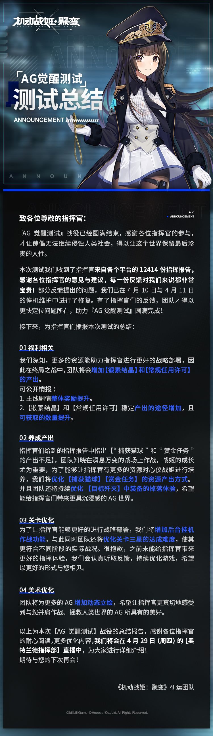”本次【AG觉醒测试】团队收到了许多来自指挥官的指挥报告,我们认真阅读了每一条反馈,对本次未能给您带来更好的游戏体验表示歉意,本次测试非游戏最终品质,我们将会根据反馈不断优化,希望能以更好的《机动战姬:聚变》与您相见。