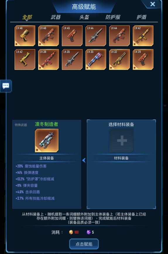 接下来就剩下最后的【赋能】了,这个系统可得好好说道说道,还是很实用滴!与突破机枪守护者类似,赋能系统主要针对武器的词缀,即额外加成,一般会有六条。赋能的目的就是替换掉垃圾词缀让武器更加完美,所以低端武器就不用考虑了嗷~