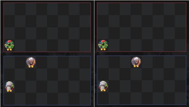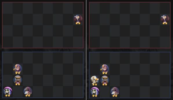 b)前排棋子开战后会向前冲,被后排卡位置了会短暂停留,被两个后排卡在角上时会不动(卡位置:上方格子有一个或多个棋子)