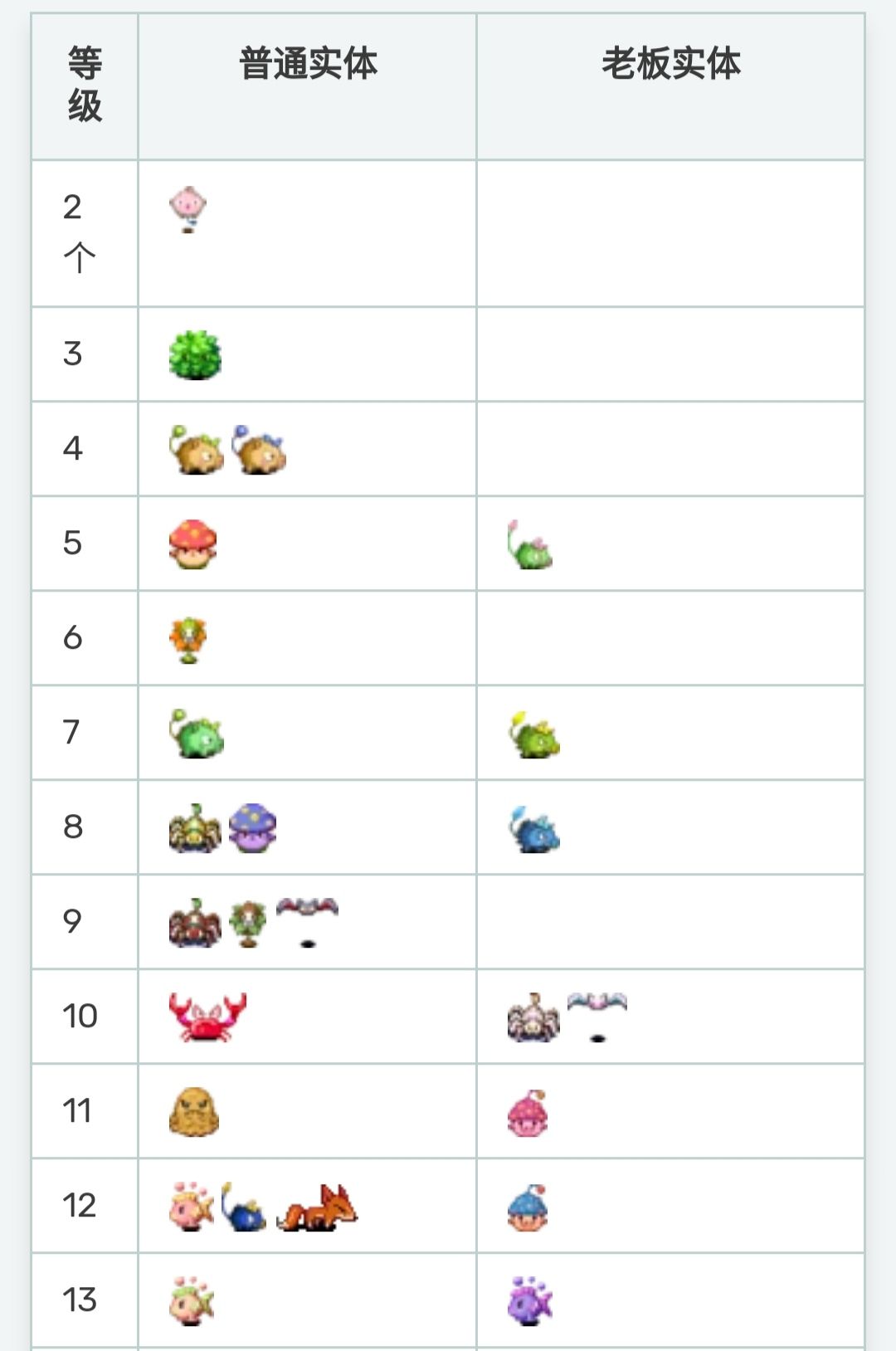 下面是怪物等级表,左边普通小怪,右边boss及mini