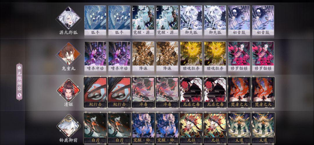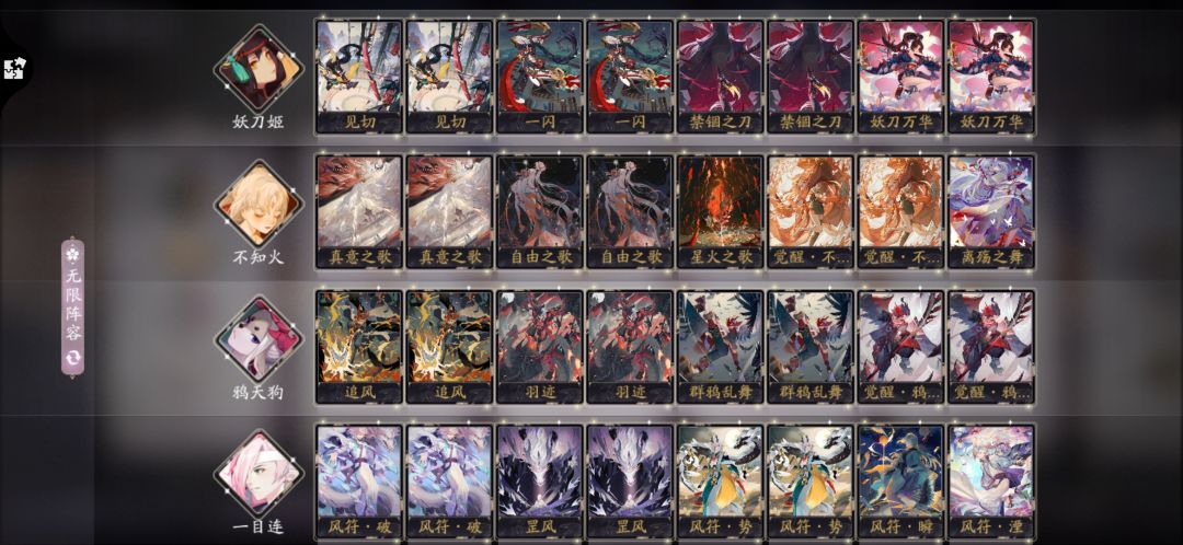 红莲卡组整体强度在天梯都不算特别高,没有青岚队解场强,没有苍叶抢血快,但绝对可以玩。红莲队的带法有很多,反正思路就是养火趣魔,除了火趣魔其他三个式神都可以根据自己的情况替换。