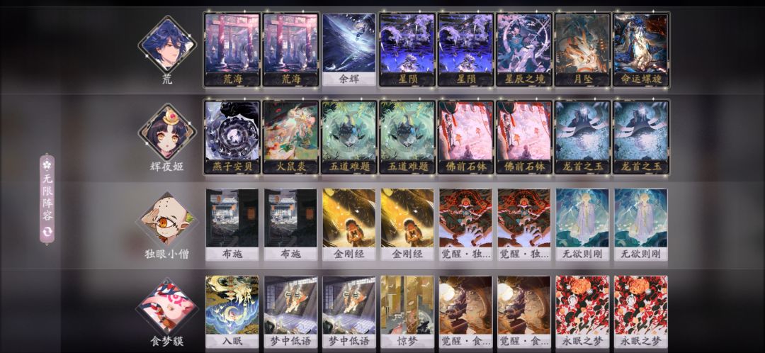 两套幻境,一套带小僧,一套传统幻境猪,一张月坠必备,带卡变化多。虽然幻境在这个版本不是特别吃香,但总的来说,名士之前都是可以用的,由于目前苍叶快攻多,所以这两套更推荐带小僧的。