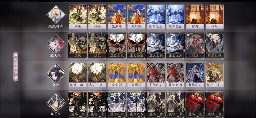 上个版本很强的跳哥快攻,这个版本强度一般,跳哥有SSR可以换掉一张死而复生,其他也可以根据个人理解自行改变,缺点和上一个青岚快攻一样,操作难度大,萌新玩家慎入。