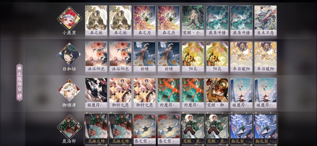 传统充能队,在这个版本强度算中等,不上不下,祈晴的上手对于整个卡组很重要,抗快,优势在于后期强,斩杀手段多,有鹿角和炭治郎,也可以和苍叶快抗衡。