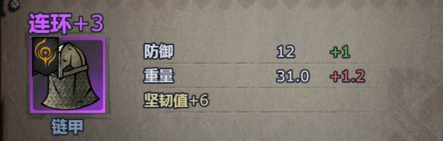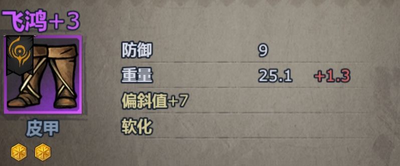 收益 增重(防御力➕5 重量+3)—硬化(防御力+6 重量+4)—曲面(斩击防御力➕19)