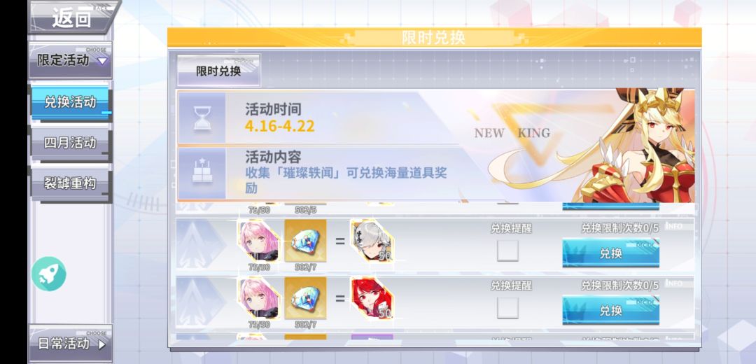 中间消耗品璀璨轶闻基本大家都有很多库存,如果是刚建号的萌新,就要肝左边的“四月活动”才能获得