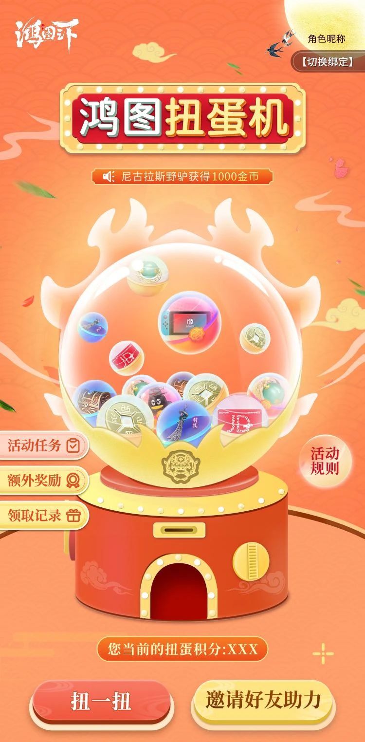 活动内容:半周年庆典期间,鸿图扭蛋机又限时开张啦~这次扭蛋机奖励全面升级,福利超级加倍!任天堂Switch、500元京东卡、“关鹅爷”QQ公仔、666珠玉等丰厚福利,等你抱走!活动期间,每日登录、分享活动、邀请好友助力,均可获得不同数量的扭蛋积分。每消耗一定积分即可进行一次扭蛋抽奖~快来扭一扭,解锁丰厚奖励吧!(详细规则见活动页面)