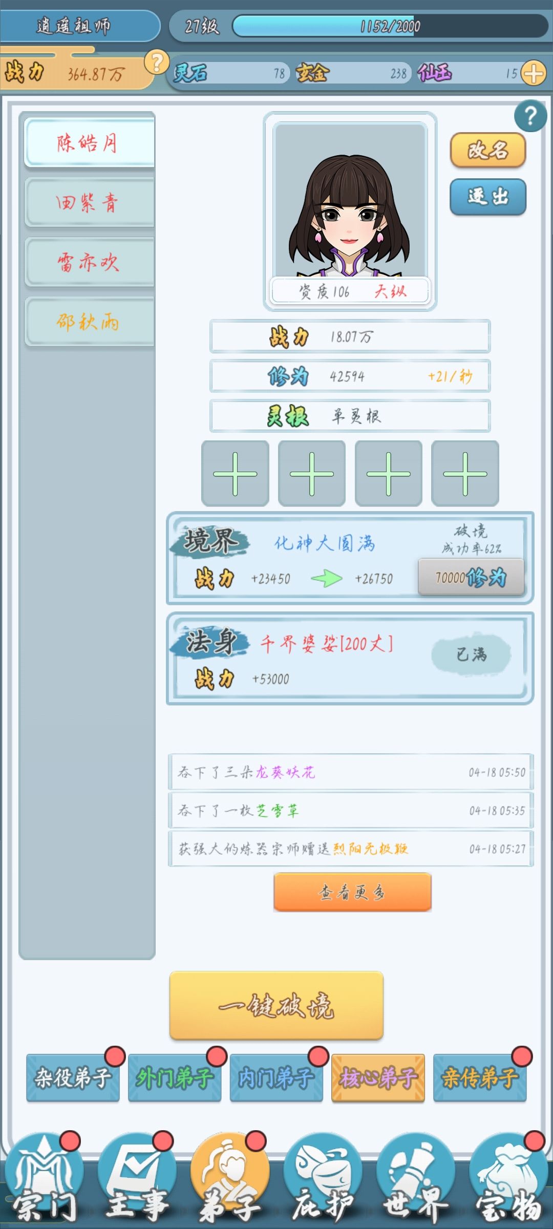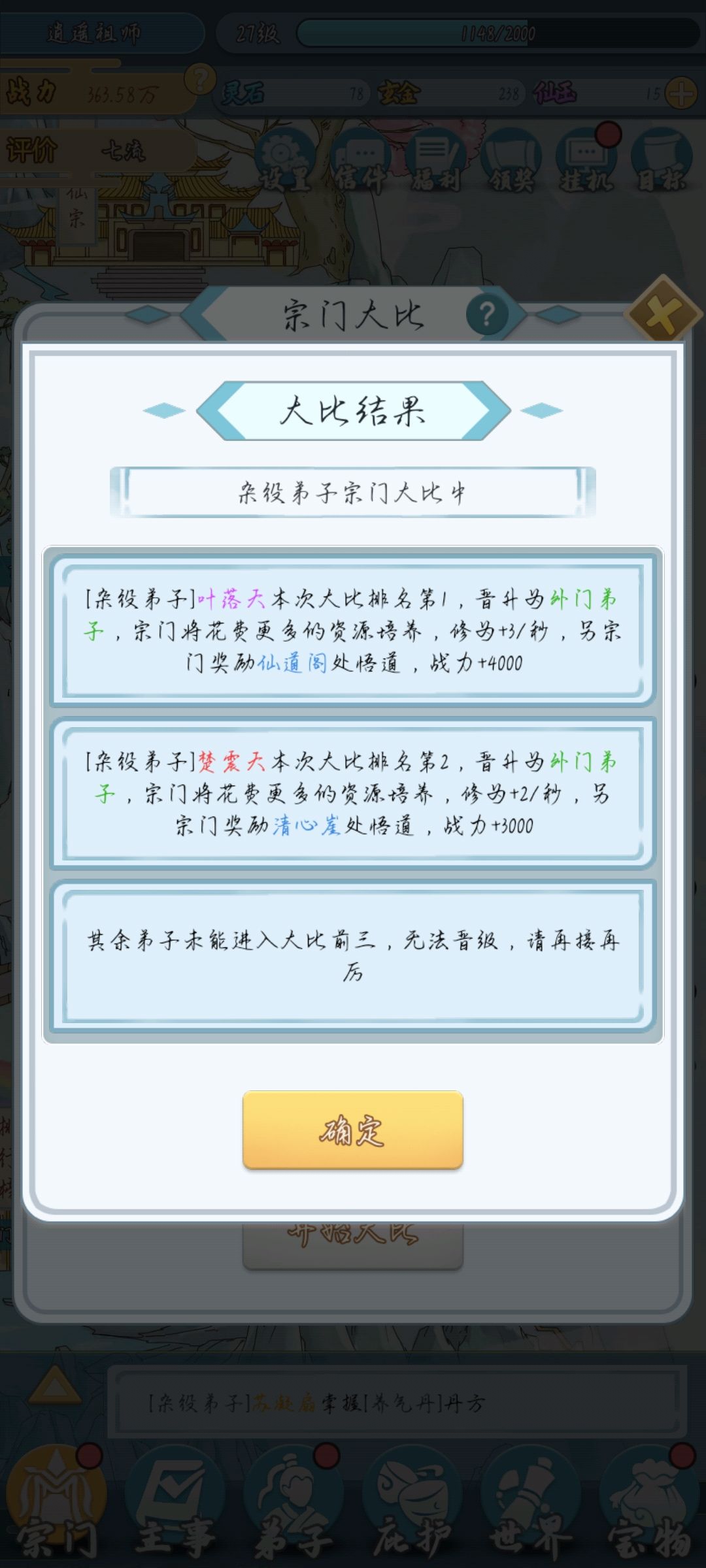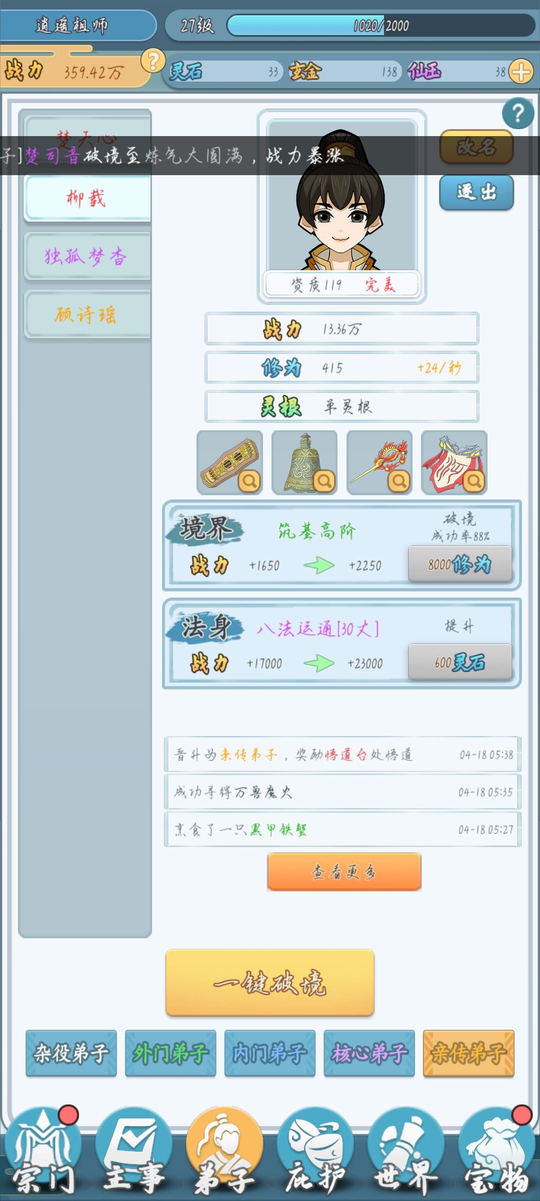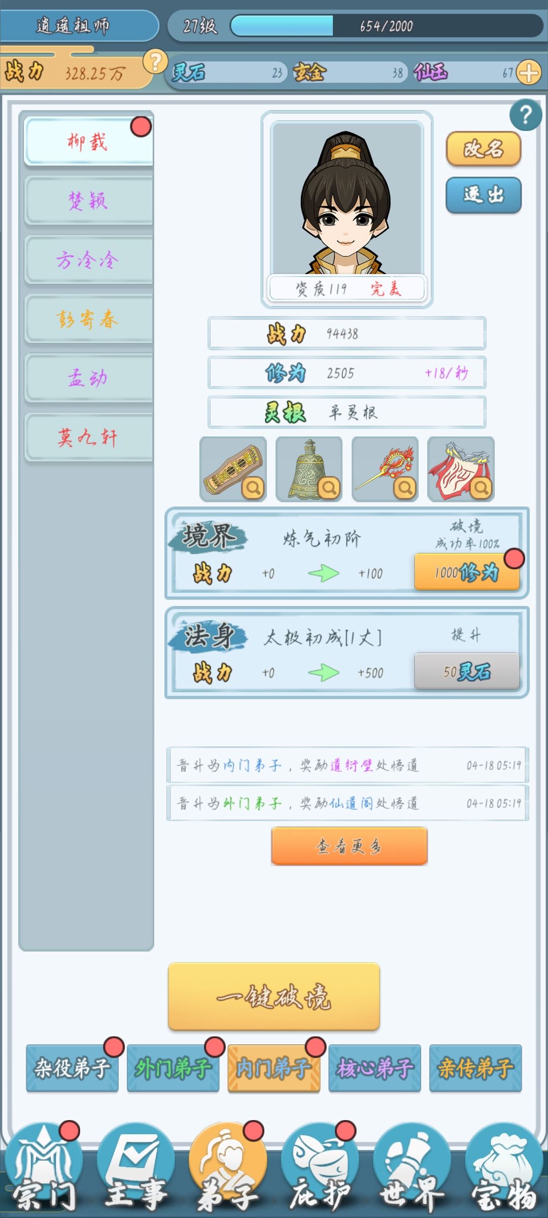 核心刷法就是刷了装备给要升阶的人套上,让他自力更生,不要占用我游历的位置以及杂役弟子的坑。