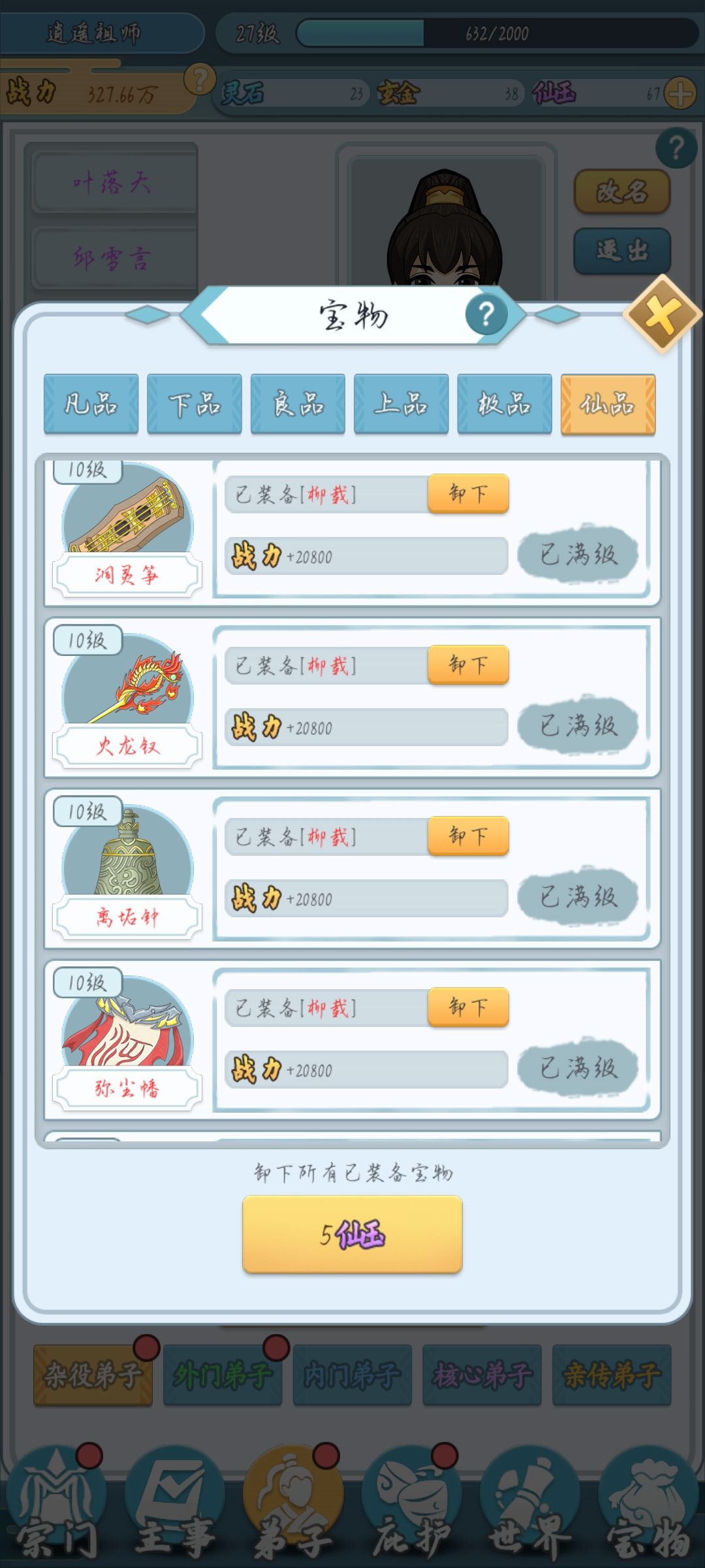 每次用五个仙玉卸下所有装备,尽可能多的给弟子安排上进阶(注意考虑CD)