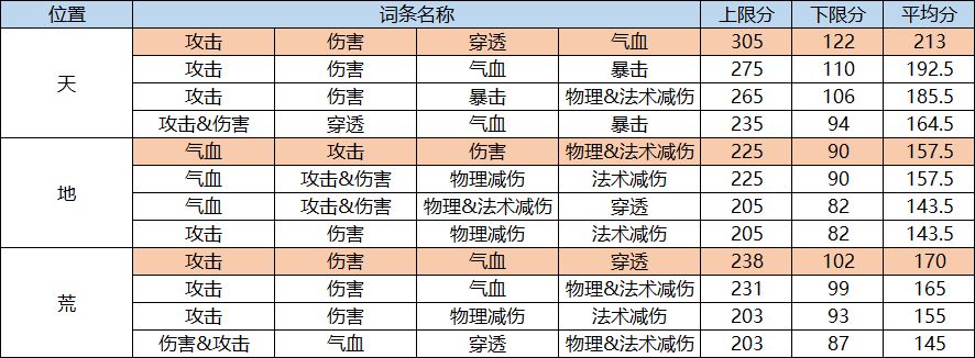 将天、地、荒按照词条分数收益排序如下: