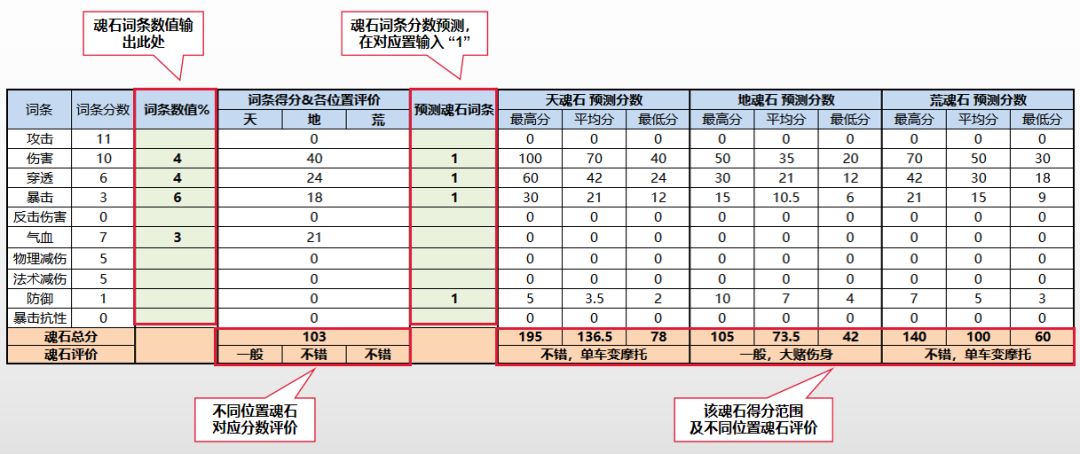 这个表有两个功能,可以计算已有魂石得分,也可以赌石之前看一下魂石词条分数范围,并给出建议