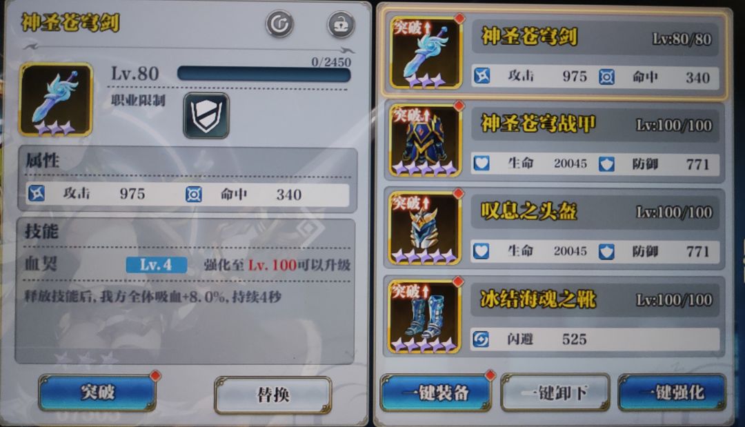 图中可以看到,我现在用的是80级的苍穹剑,开大之后我方全体增加8%吸血,而这个吸血有多大用途呢,下边我放一段视频。
