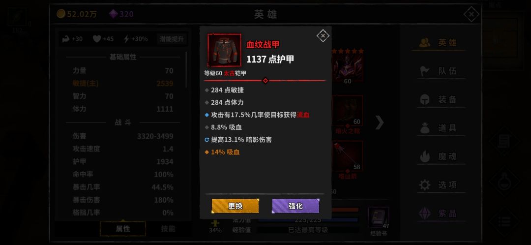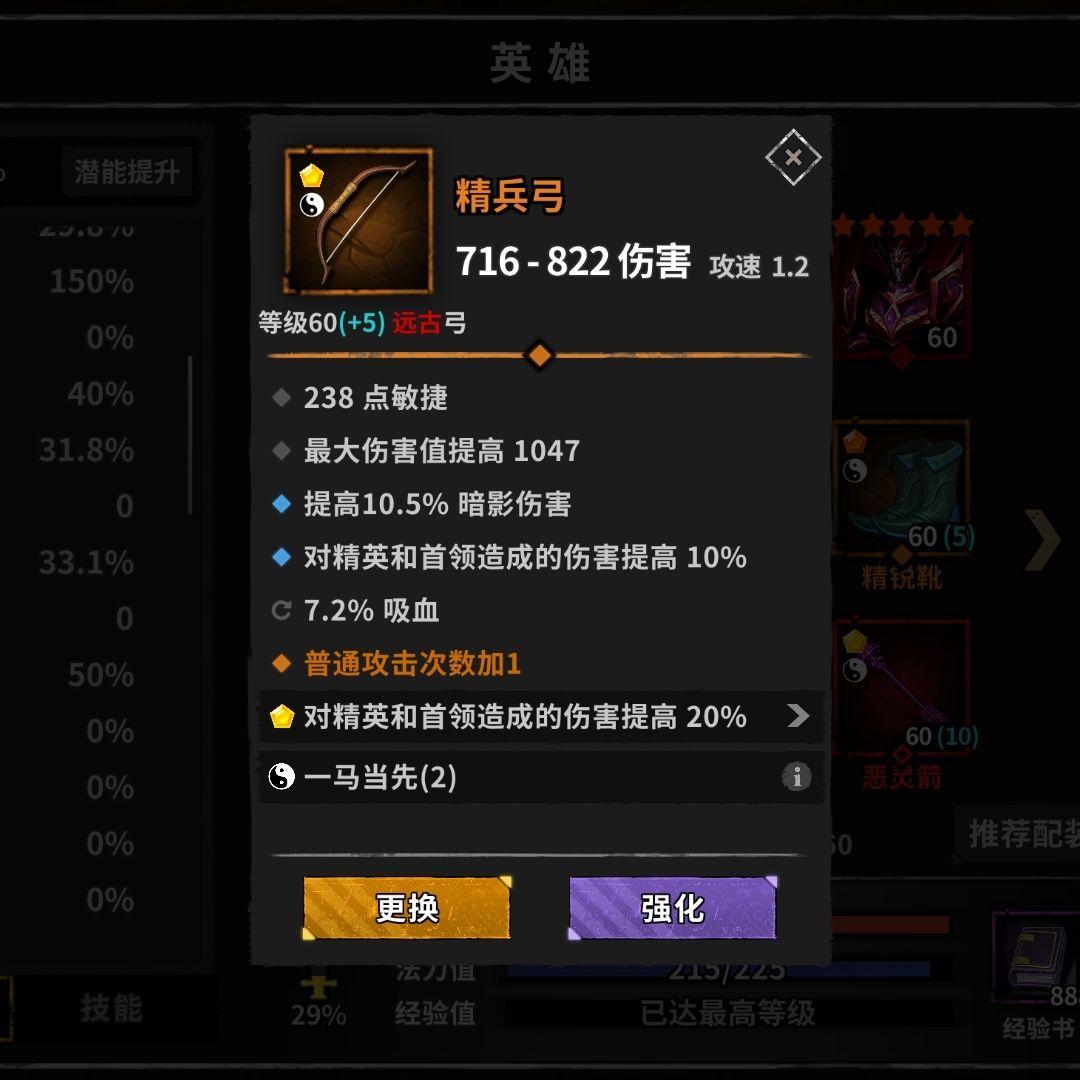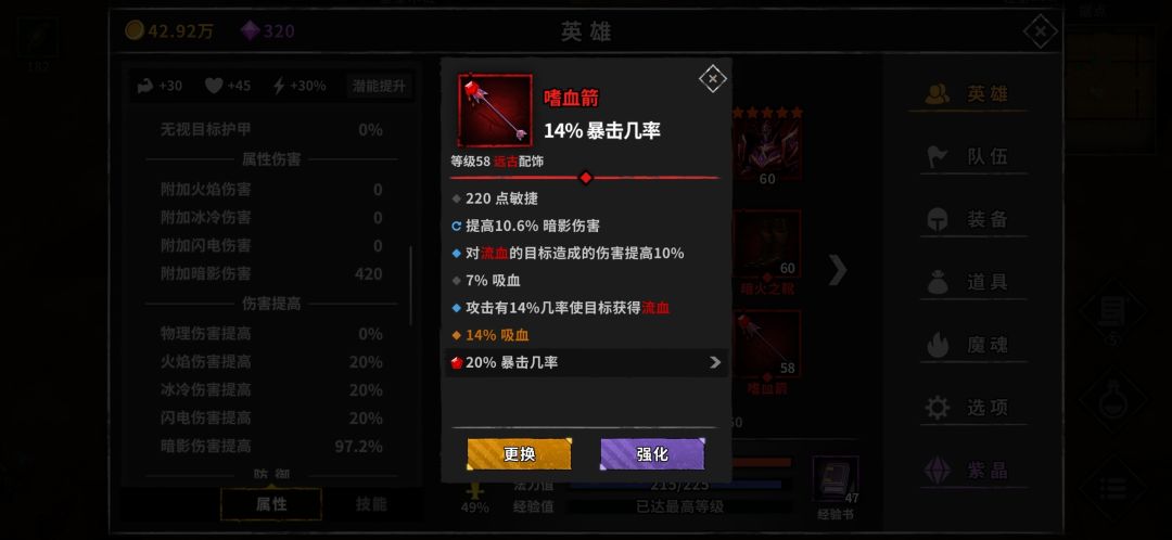 嗜血箭(异常装,这个和凤羽同理,没条件不用洗词条。如果有稳定队友或者搭配血纹战甲,可以把概率流血洗成最大伤害。太古毕业装,比橙装更强。橙装也没有双敏捷的,强化之后基础属性提高不少。)