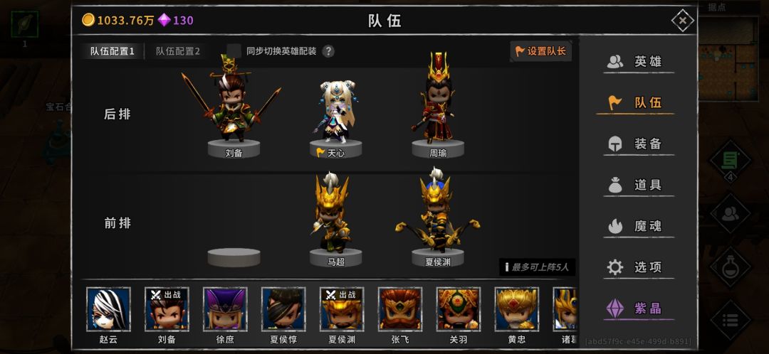 两一马当先,三玲珑之心(最高配,伤害最高,天心队长。若需要用夏侯队长,不适合这套。)