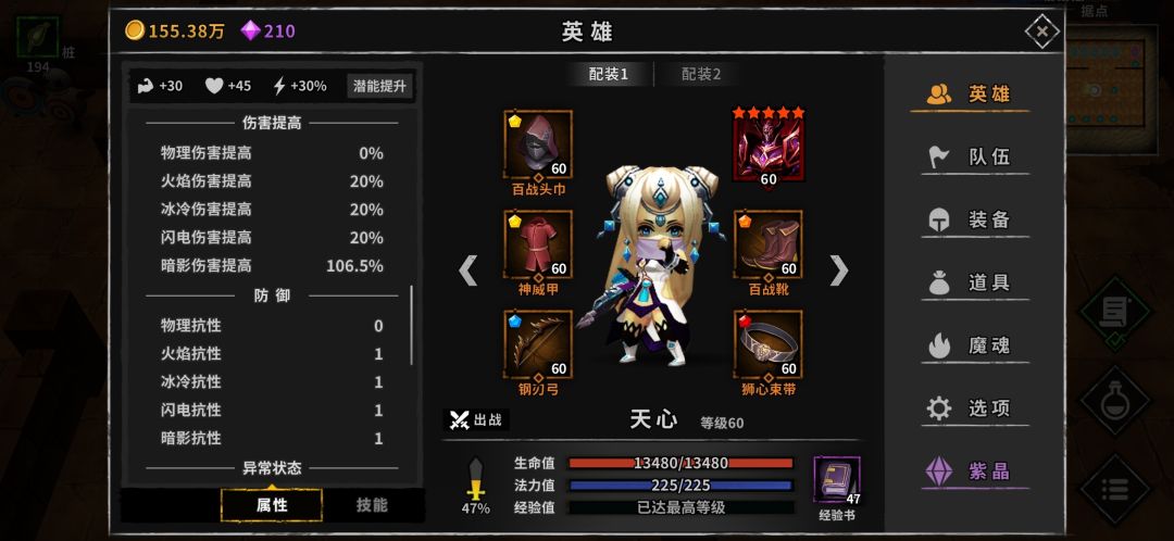 饰品选择满法力提高25%伤害或者每1个不良状态,造成伤害提高7%。
