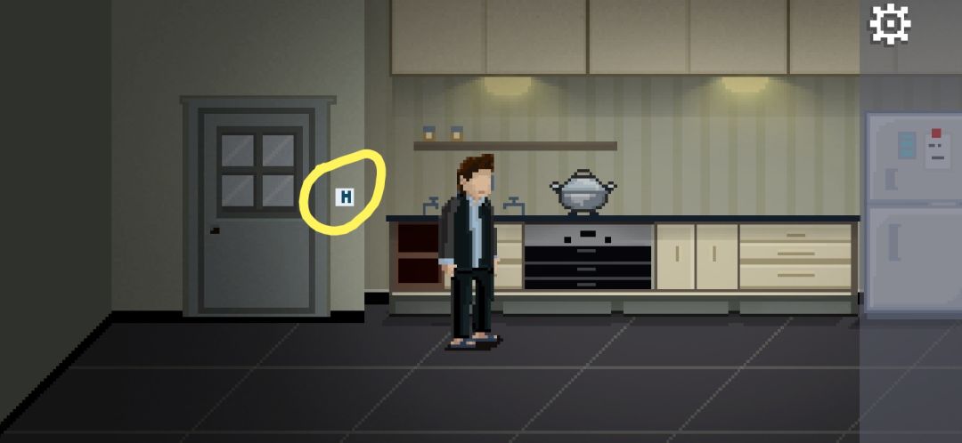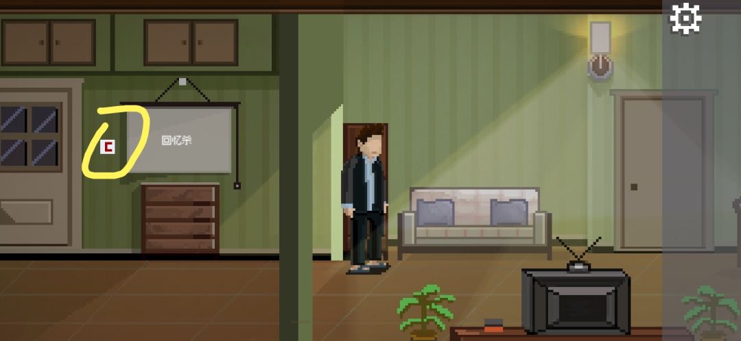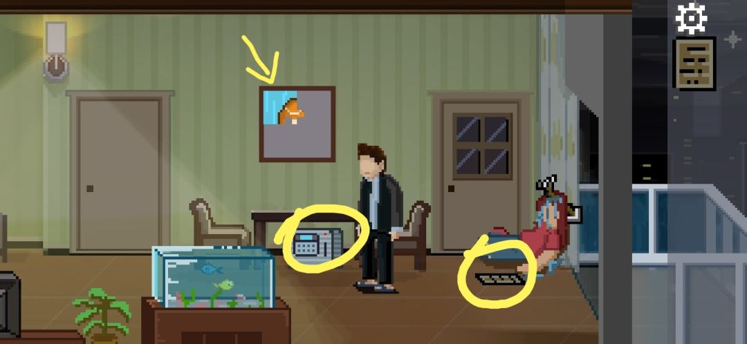 按一下墙上的白色机关,上面有一排按钮,下面有四个提示,按提示把上面四个柜子的把手都转到左边,会掉落钥匙。点击妻子,提示凶手在右边,好的继续往右走。