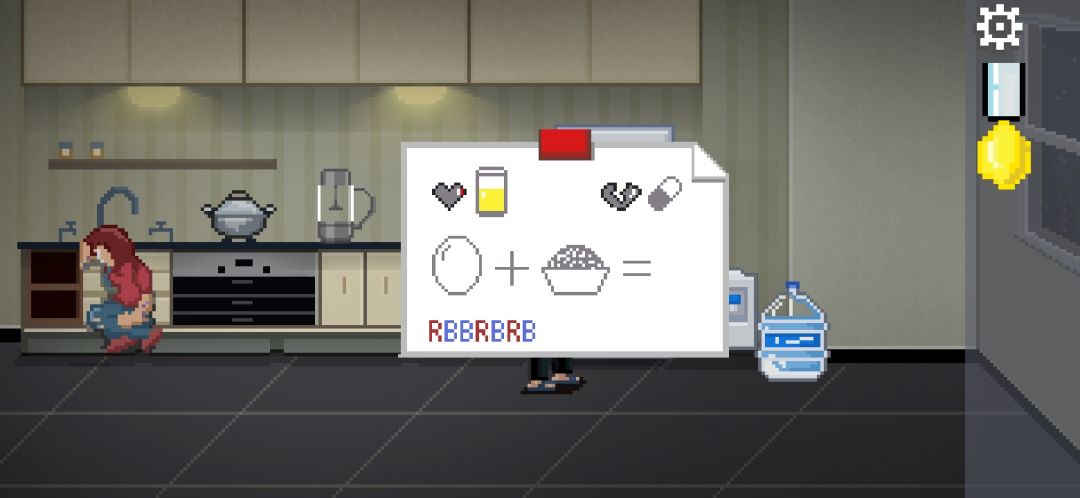 打开冰箱下层获得一个柠檬;点击水桶装饮水机,根据冰箱上贴的纸条提示的红蓝点击水龙头,打开后即可用玻璃杯装水。把柠檬和水分别装入榨汁机,拾取柠檬汁喂给妻子。