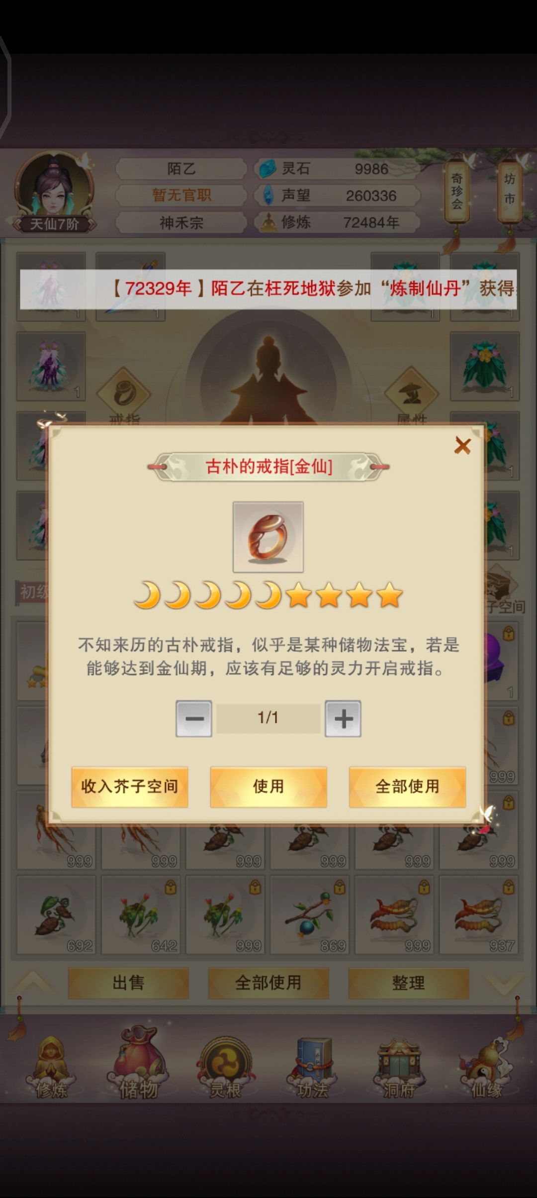 古朴的戒指奖励对前期新人玩家来说十分丰富,每提升一个大境界就要记得使用。特别是金丹和元婴期的奖励,会赠送炼丹炼器经验和一品炉子,外加一品的洗髓与浑天丹。这样的话就不用刻意去刷有炼丹炼器的宗门,省了不少时间与精力。