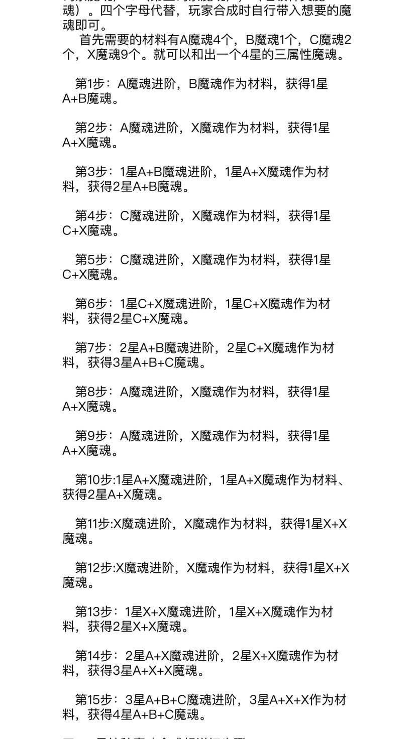 这个是最老版本的四星杂魔魂和纯魔魂的合成方案,升五星根据自己需要,再根据四星魔魂合成方法在合一个四星的加进去就行了,上纯下杂。