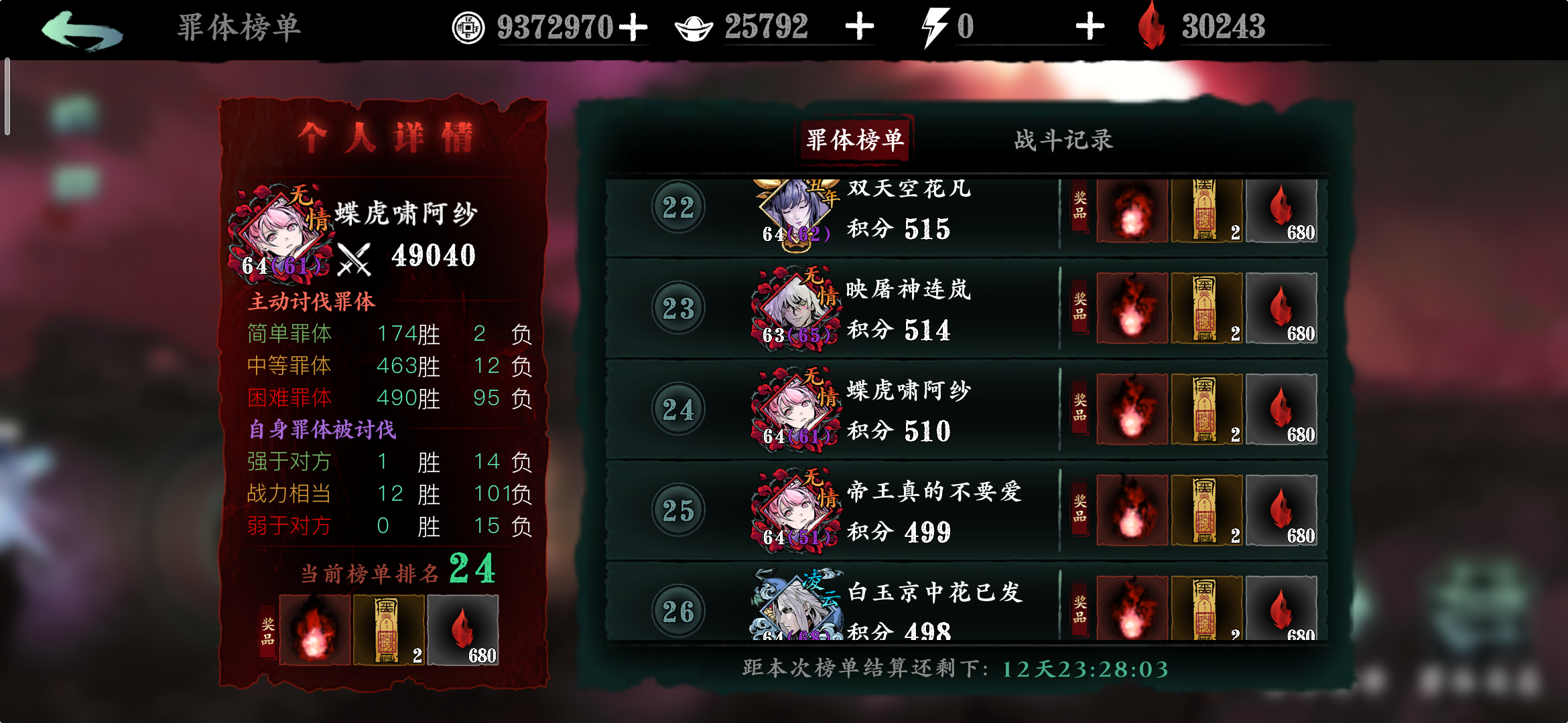 过了十二点开始刷榜单,七个固定罪体四个难度一共350积分,罪恶深渊三次一共96积分。我都刷了应该是446。但现在我服罪体榜如图