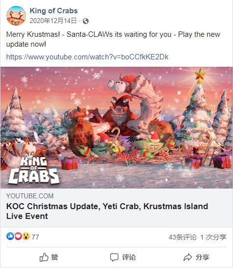 2019年3月上线的游戏,两个多年头了。螃蟹之王英文叫作King of Crabs。
