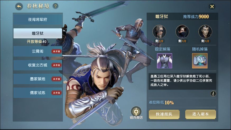 2、队伍模式春秋秘境副本,30级、40级、50级、60级、70级各开放一个秘境。副本难度较高,请最少组