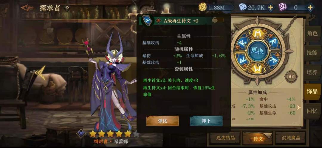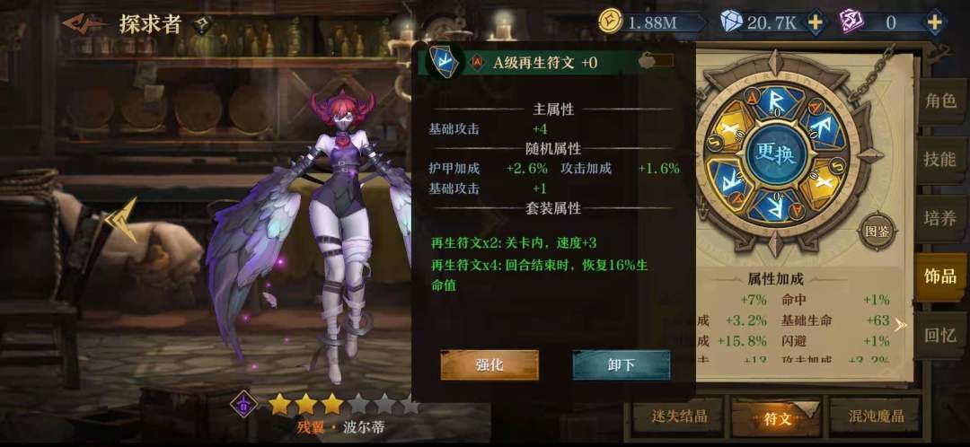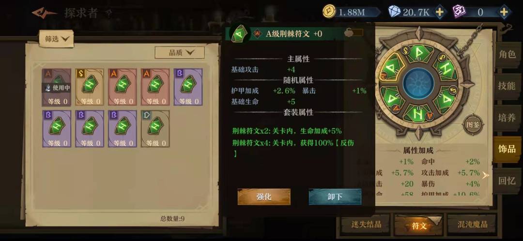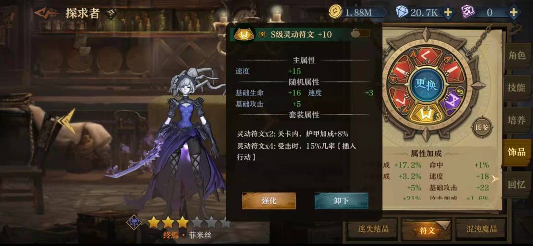 符文我也是看了很多帖子以及排名靠前公主的配置,关键就是最下方的符文以及右下方的符文,最下方找主属性速度的S,最好副属性也有速度,右下方符文主属性找暴击率,副属性也找暴击率,在金币允许的范围内强化越高越好。其他位置可以凑一下加暴击率的散件,或者用那个三回合加百分之二十暴击率的,这个我没用,因为我发现高层很多时候三回合砍不死。副属性选一些暴伤或者攻击的。如果有神威结晶,也可以选择那个对小体型提升伤害的,我没有只是猜测。