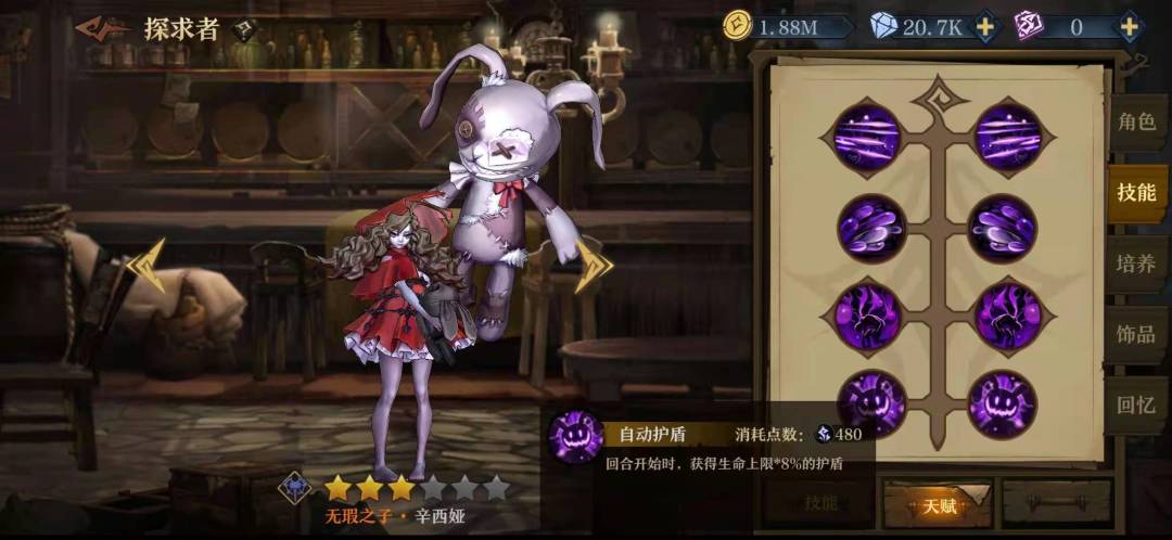 作为一个免费送的英雄,她的功能可以说非常全面了,能加debuff,能单体攻击能aoe,还能回血,她能放在二号位的原因主要是她的天赋可以点出每回合增加最大生命百分之八的护盾。