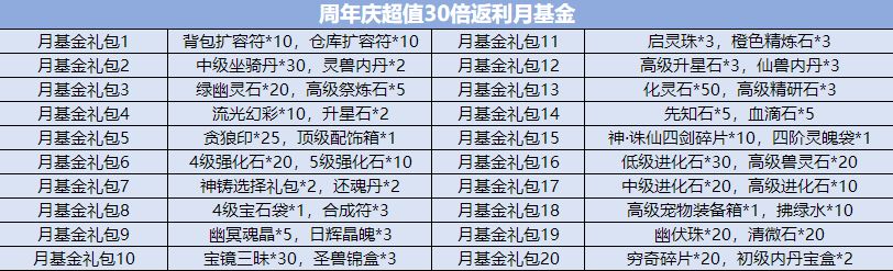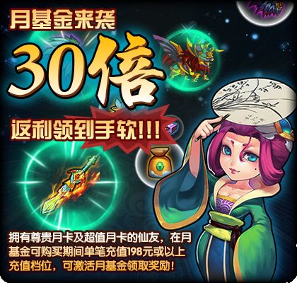 活动内容:当玩家同时拥有尊贵月卡与超值月卡,在周年庆月基金活动期间,再单笔充值198元或以上档位可以激活月基金,激活后可以每天签到领取一次特殊奖励,持续20天。