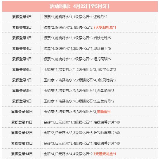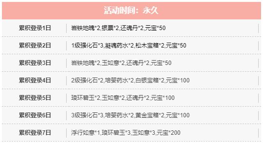 活动内容:活动期间累积登录对应天数即可获得如下奖励(活动界面领取)