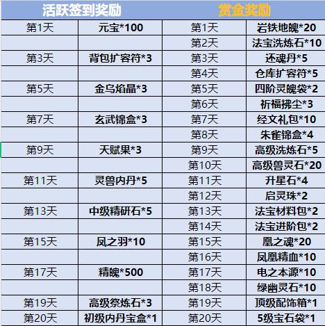 活动内容:活动期间每天完成每日任务活跃度达到100即可领取活跃签到奖励,购买赏金礼包的玩家还可以额外领取一份赏金奖励
